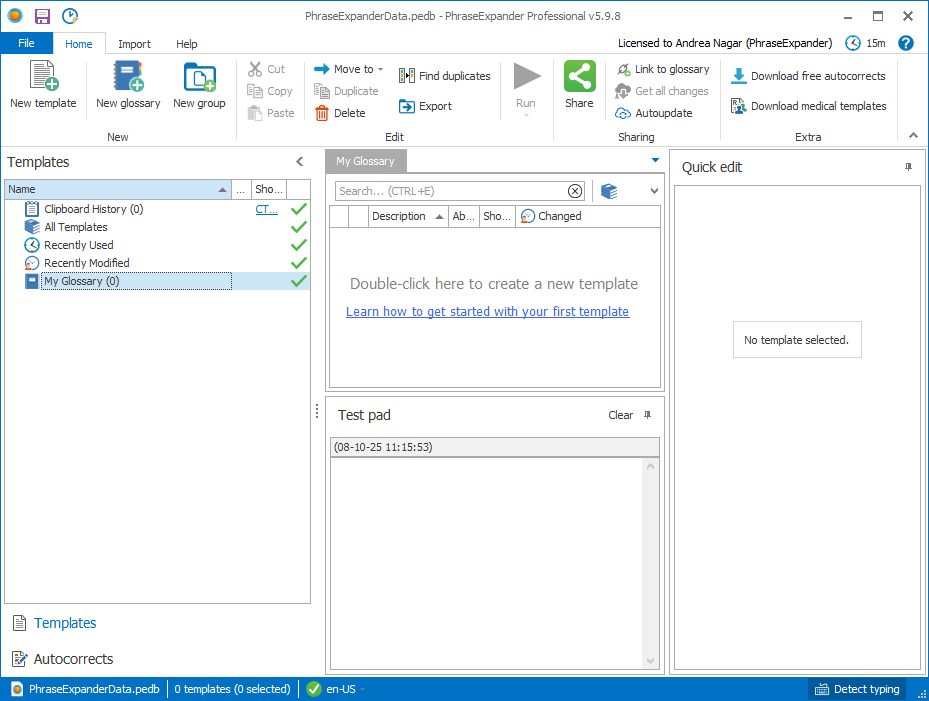 NOTE: The PhraseExpander database should always be stored locally, and MUST not be shared with other people. You can use shared glossaries for that.
