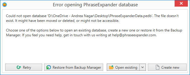 In certain situations, PhraseExpander might not be able to load your database (the file that contains all your data, templates, and autocorrects).