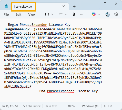 An example of a PhraseExpander license key. Use your own Create a text file called licensekey.txt