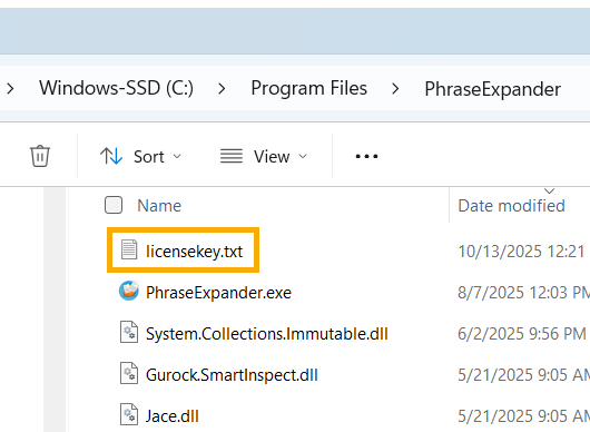Copy licensekey.txt to C:\Program Files\PhraseExpander