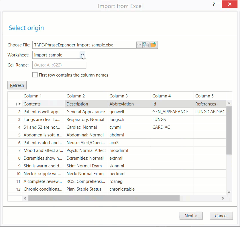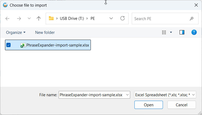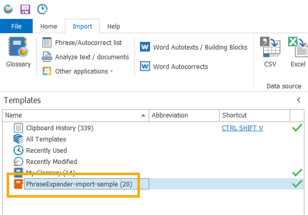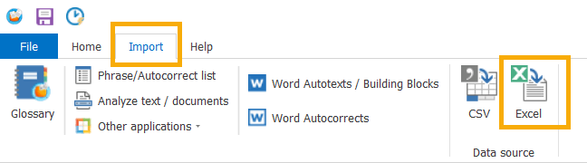 PhraseExpander can import data from CSV or Excel files to create and populate glossaries. It will create an entry (either template or autocorrect) for each row in the table.