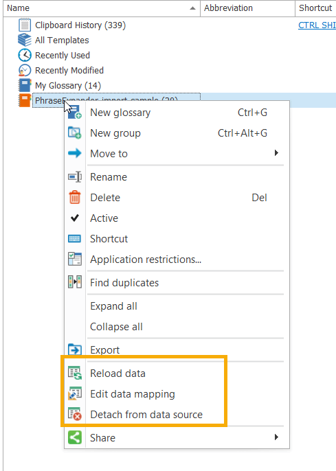 If you chose the Link to Glossary option in #5 (above), PhraseExpander can update your glossary if your data changes.